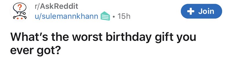 While this thread may seem like "first world problems" to some of you, we found it to be pretty entertaining. Earlier today, Redditor u/sulemannkhan asked the r/AskReddit community to share the absolute worst birthday gifts they'd ever received. The people of Reddit complied, sharing tragic tales of callous re-gifting, second-hand hairbrushes, and for one lucky eighteen-year-old? A used Disney coloring book. If you've ever received a "dud" gift and had to bite your tongue and feign happiness, this gallery is for you.